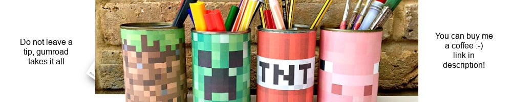 A lovely little minecraft craft - make these quirky and fun Minecraft Pen Pots with this easy printable. 4 designs available! (Do NOT leave a tip, gumroad takes it all - but you can buy me a coffee here :-) https://buymeacoffee.com/redtedart