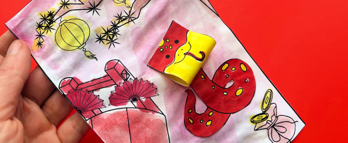 A fun Year of the Snake Coloring Page activity doe 2025. Explore mixed media with this simple 3d Snake Coloring Page. Use watercolors for the background and marker pens of felt tips for the dragon.